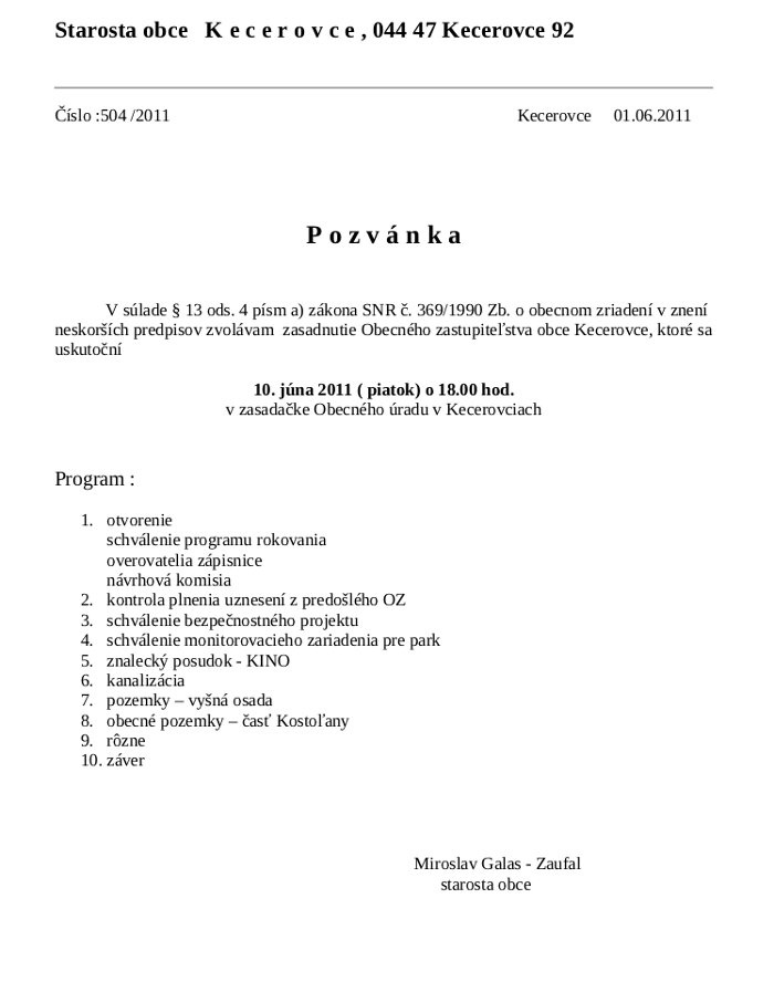 Pozvánka na zasadnutie obecného zastupiteľstva 10.6.2025