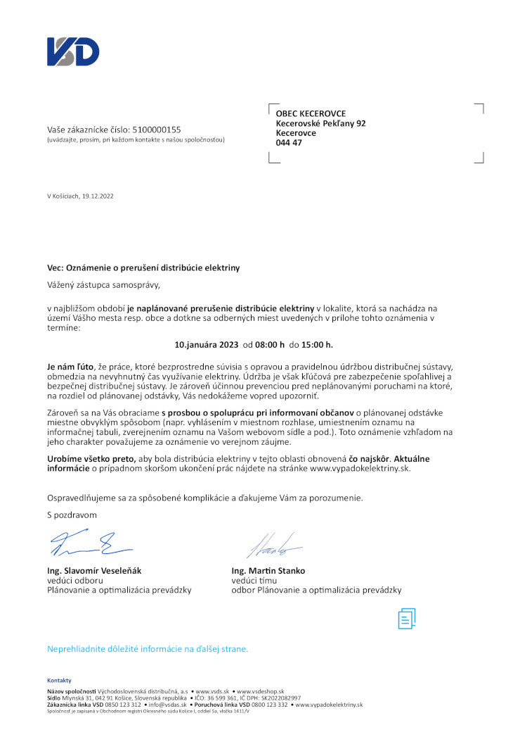 Oznam - prerušenie distribúcie elektriny 10.1.2023