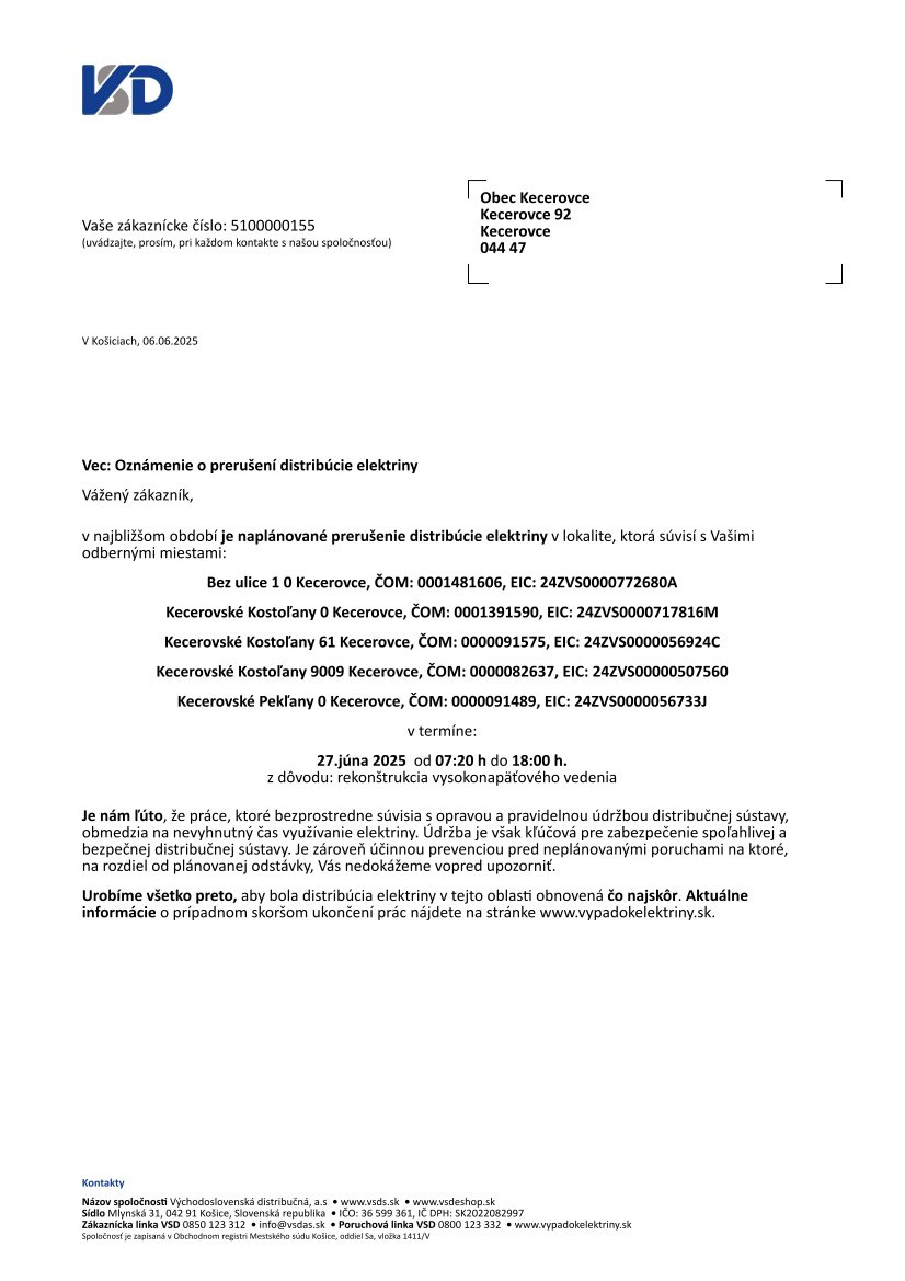 • Oznam - prerušenie distribúcie elektriny 27.6.2025
