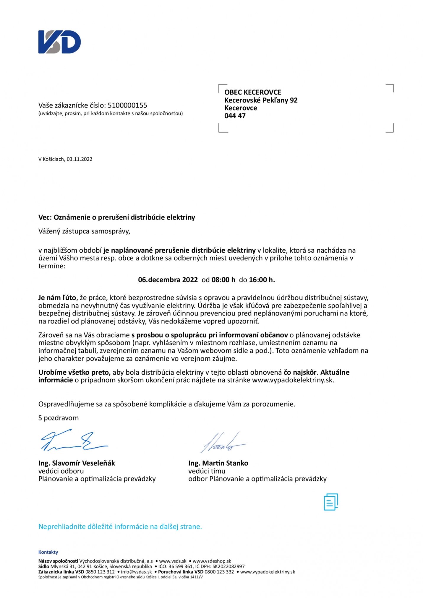 Oznam - prerušenie distribúcie elektriny 6.12.2022