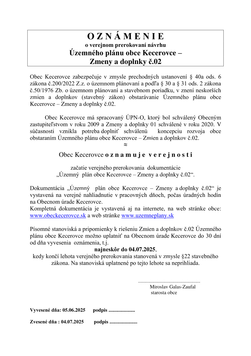 Oznámenie o verejnom prerokovaní návrhu Územného plánu obce Kecerovce – Zmeny a doplnky č.02