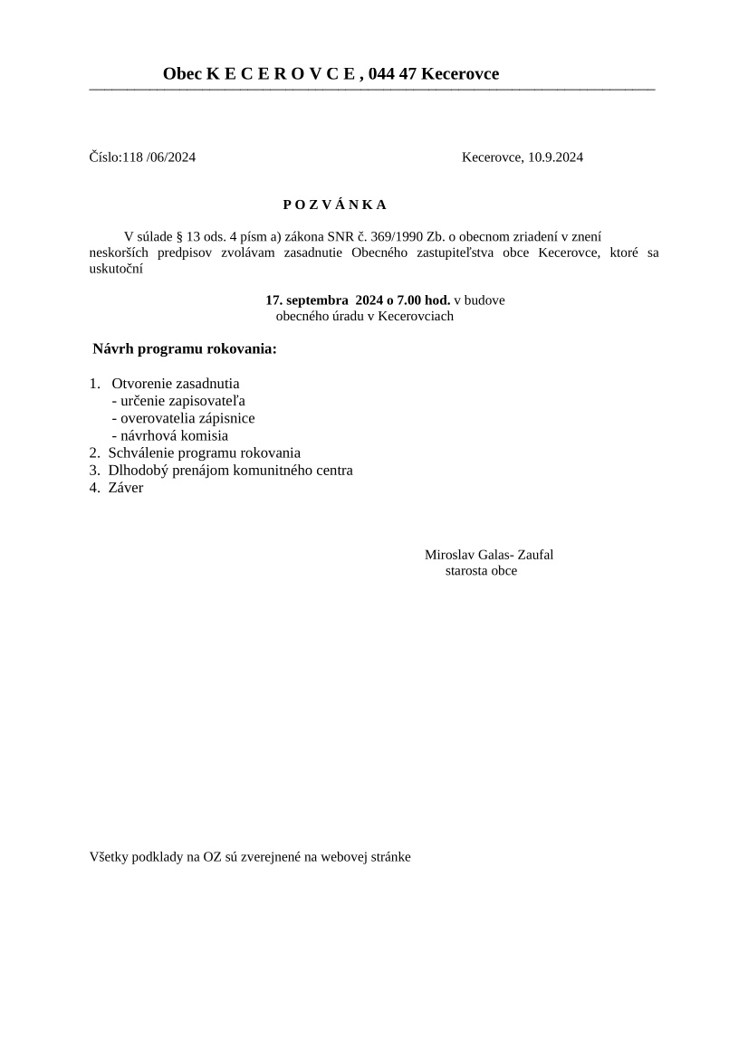 Pozvánka na zasadnutie obecného zastupiteľstva 17.09.2024