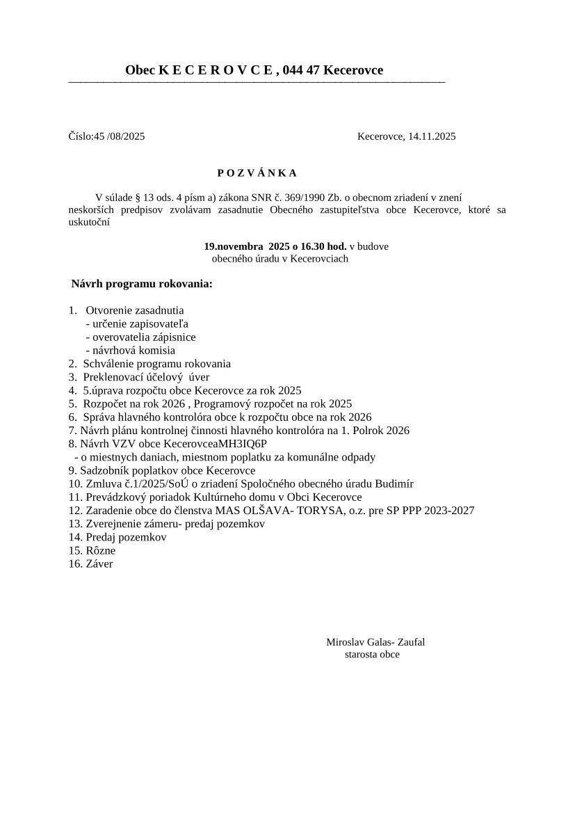 Pozvánka na zasadnutie obecného zastupiteľstva 19.11.2025