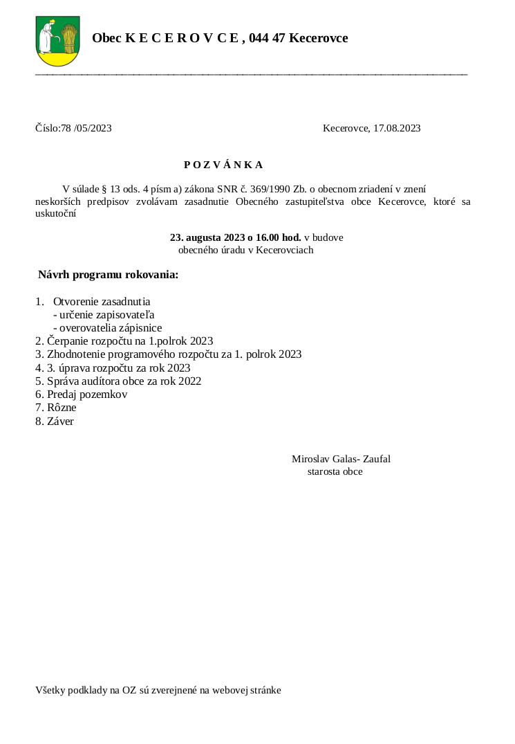 Pozvánka na zasadnutie obecného zastupiteľstva 23.8.2023