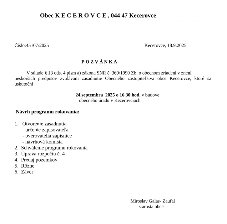 Pozvánka na zasadnutie obecného zastupiteľstva 24.9.2025