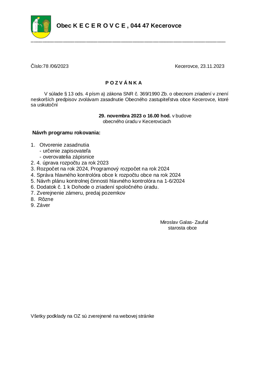 Pozvánka na zasadnutie obecného zastupiteľstva 29.11.2023