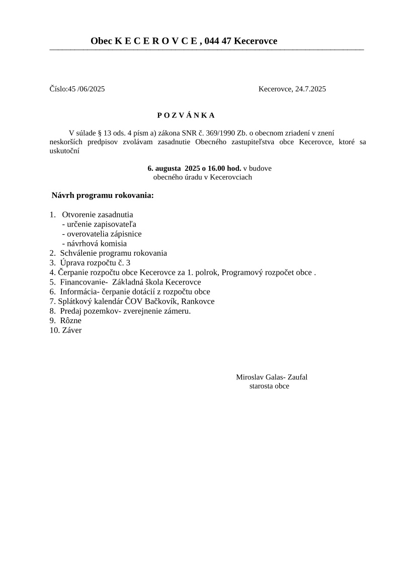 Pozvánka na zasadnutie obecného zastupiteľstva 6.8.2025