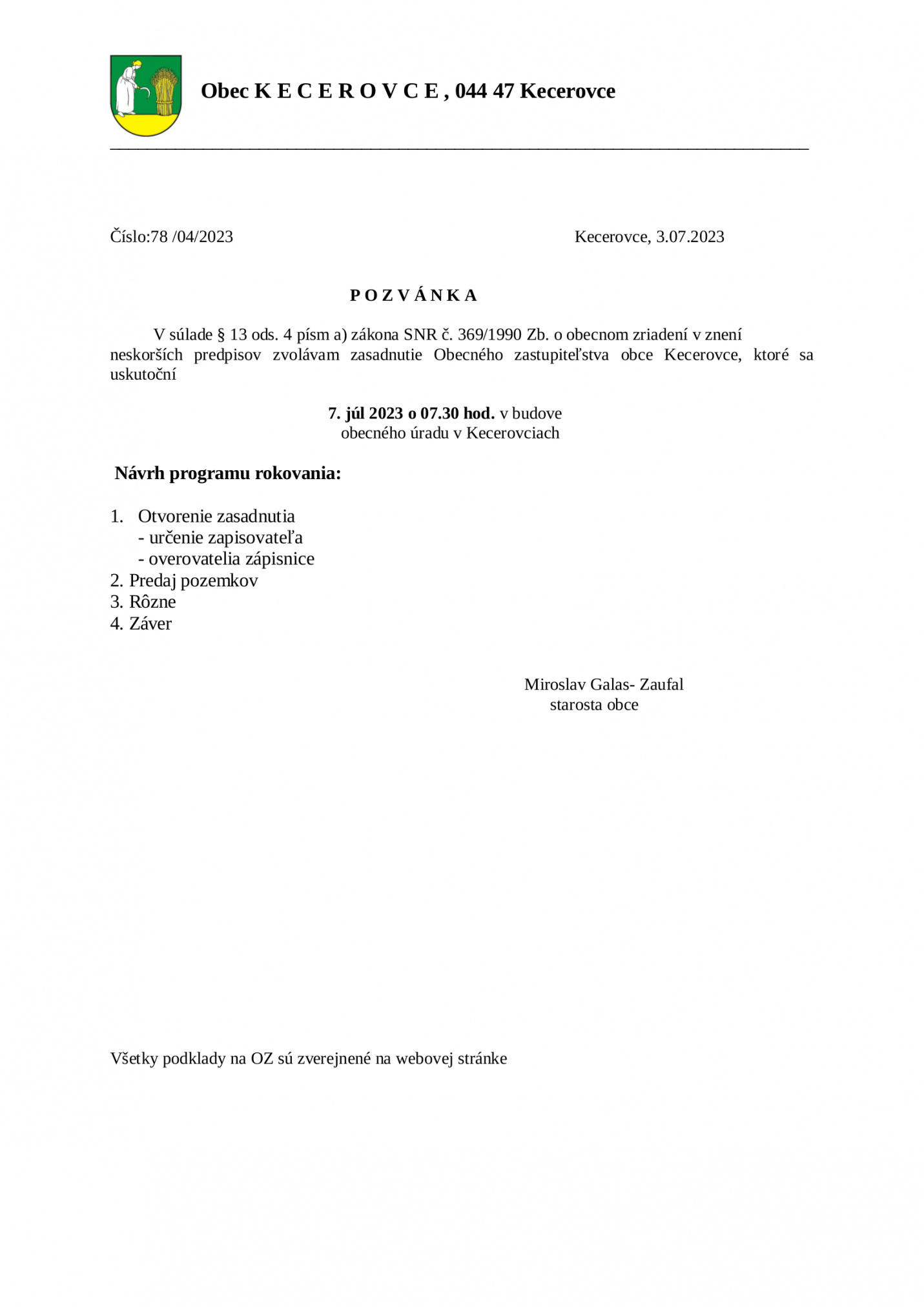 Pozvánka na zasadnutie obecného zastupiteľstva 7.7.2023