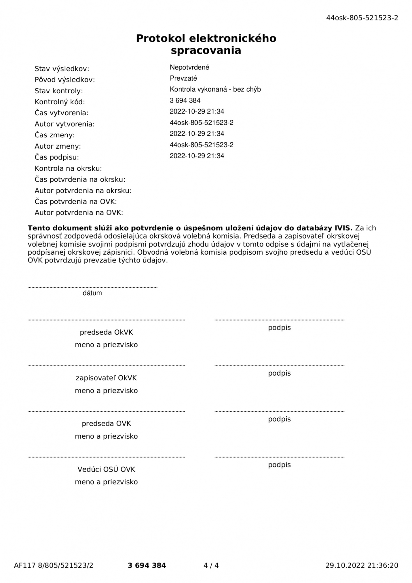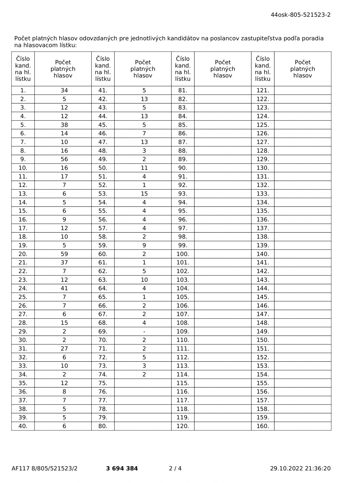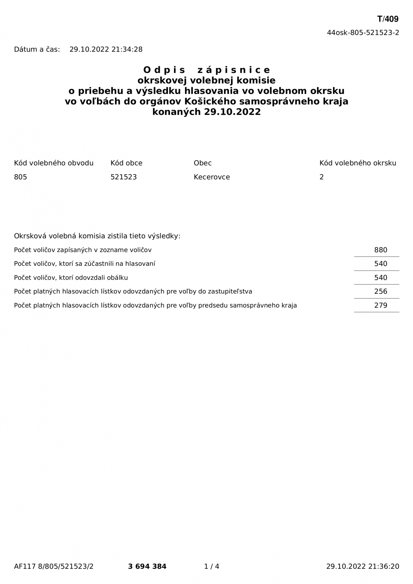 Voľby 2022 - Odpis zápisnice okrskovej volebnej komisie o priebehu a výsledku hlasovania vo volebnom okrsku vo voľbách do orgánov Košického samosprávneho kraja konaných 29.10.2022 - okrsok 2
